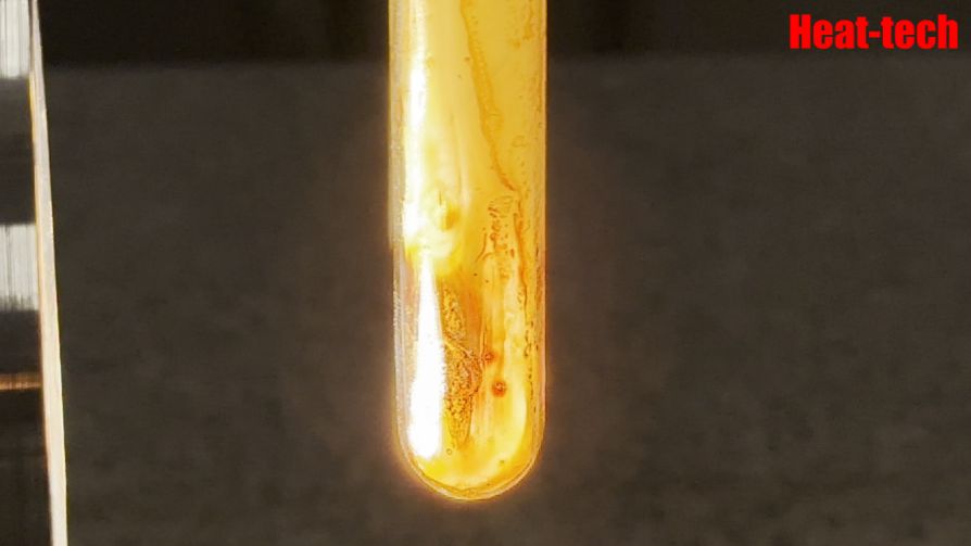 สารระเหยที่เกิดขึ้นจะถูกทำให้เย็นและควบแน่นเนื่องจากความแตกต่างของอุณหภูมิภายในหลอดทดลอง และมีการสังเกตการยึดเกาะบนผนังด้านในในลักษณะของสารคล้ายทาร์และน้ำมัน